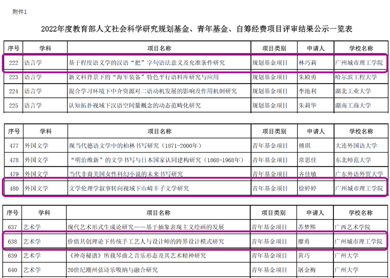 本网讯(记者 罗兰 张佳佳)8月5日,教育部社科司发布的《2022年度教育部人文社会科学研究一般项目评审结果的公示》公示期结束,伟德国际victor1946林巧莉老师、徐婷婷老师、廖勇老师申报的项目,经教育部组织专家评审、公示,获2022年度人文社会科学研究规划基金项目(1项)与青年基金项目(2项)。这是伟德国际victor1946继2019年获批教育部人文社会科学研究一般项目(1项)后,一举获得3个教育部人文社科项目,且2022年广东省同类院校共获得10个项目立项。