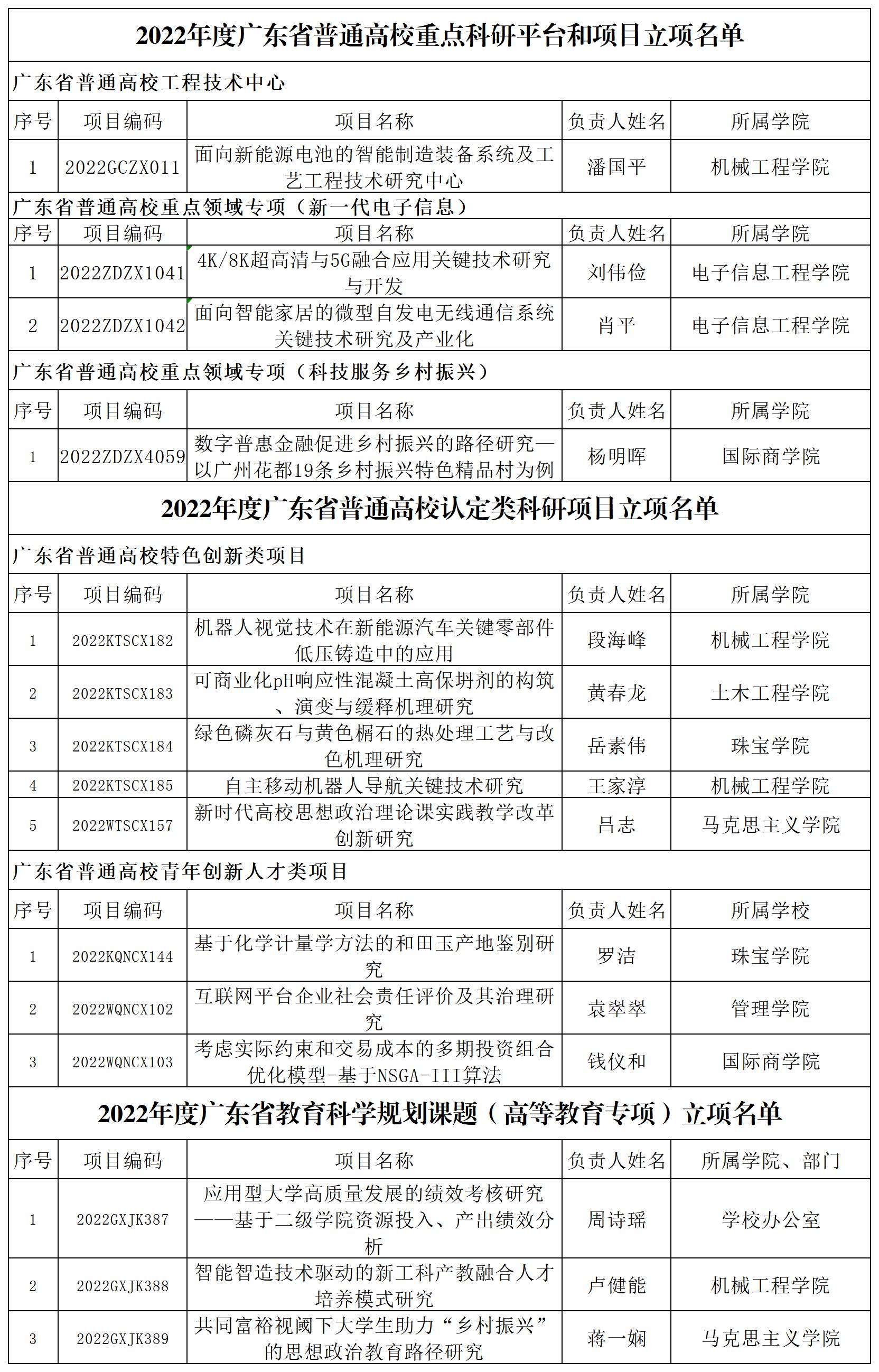 本网讯(记者冯田丽)9月13日,根据《广东省教育厅关于公布2022年度普通高校重点科研平台和项目立项名单的通知》(粤教科函〔2022〕4号)、《广东省教育厅关于公布2022年度普通高校认定类科研项目立项名单的通知》(粤教科函〔2022〕5号)《广东省教育科学规划领导小组办公室关于公布2022年度教育科学规划课题(高等教育专项)立项名单的通知》,经学科与科技处组织动员、学校推荐、省教育厅组织专家评审、认定,伟德国际victor1946分别获批立项“广东省普通高校工程技术中心”1项,“广东省普通高校重点领域专项”3项(新一代电子信息技术2项,科技服务乡村振兴1项),广东省教育科学规划课题(高等教育专项)3项,“广东省普通高校特色创新类项目”5项,“广东省普通高校青年创新人才类项目”3项。