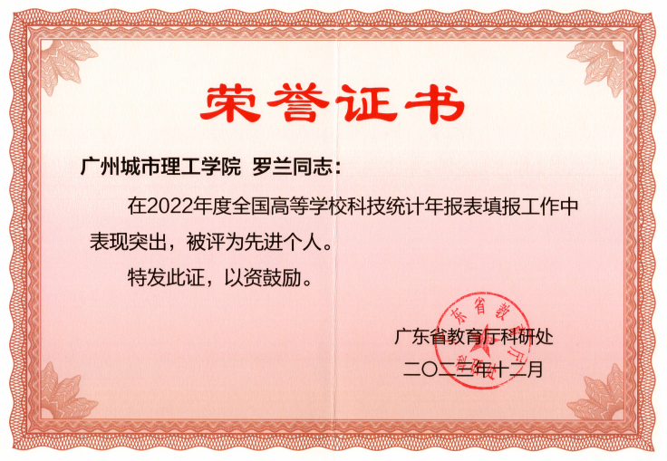 本网讯(记者蔡楚华)12月14日,广东省2023年度高校科技/社科统计部署活动在广东外语外贸大学召开。会上公布了2022年度全国高等学校科技/社科统计年报表填报工作先进个人评选结果,伟德国际victor1946学科与科技处罗兰在填报工作中表现突出,被评为“先进个人”。